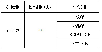 為給予學生更多的專業選擇機會,我校藝術類專業實行大類(設計學類)招生。入學一年后按照學習成績和學生志愿進行專業分流。整體招生計劃如下: