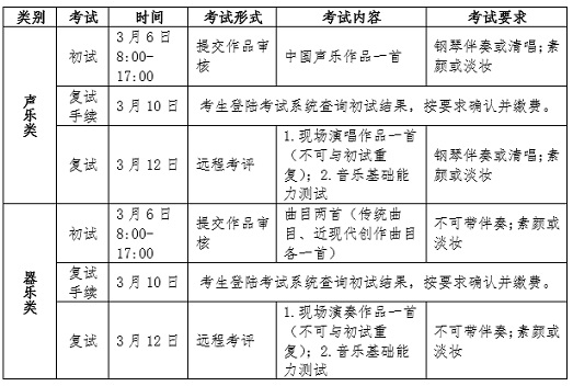 1.音樂學(音樂國際教育與傳播)專業考生須參加學校組織的線上考試。考試滿分為750分,其中初試滿分為300分、復試滿分為450分(作品唱奏400分;音樂基礎能力測試50分,含視唱練耳和樂理)。