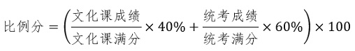 在實行平行志愿的省份,按照投檔成績從高到低的順序擇優錄取。在實行順序志愿的省份,按照比例分(四舍五入、保留小數點后兩位)從高到低的順序擇優錄取。比例分滿分為100分,計算公式為: