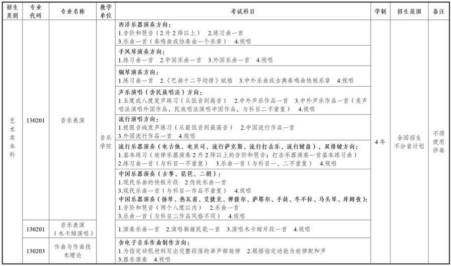 音樂表演、音樂表演(木卡姆演唱)、作曲與作曲技術理論專業組織校考,不做分省計劃,文理科(歷史類和物理類)兼招,統一排序,不單獨設置文理(歷史類和物理類)計劃數。考生在高考文化課成績(不含政策加分)達到考生所在省(區、市)普通類專業本科批次相應科類錄取最低控制分數線、省級統考本科合格、校考合格的基礎上,按照志愿優先的原則,以校考成績從高到低擇優錄取。