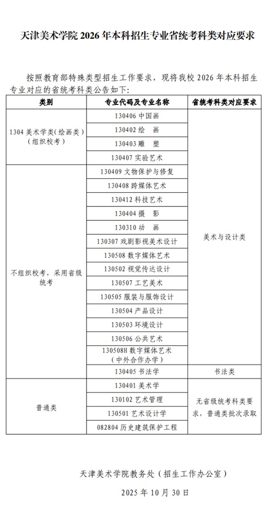 天津美術(shù)學(xué)院2026年本科招生專業(yè)省統(tǒng)考科類對(duì)應(yīng)要求