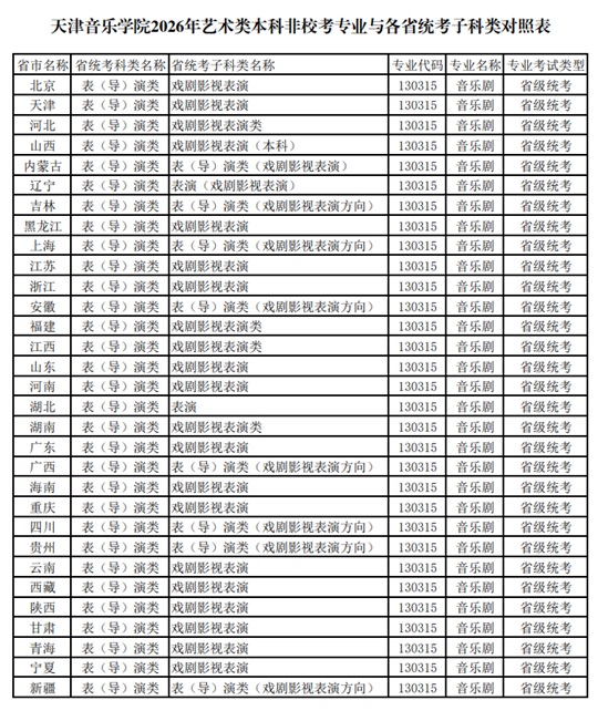 天津音樂學院2026年藝術類本科非校考專業(yè)與各省統(tǒng)考子科類對照表