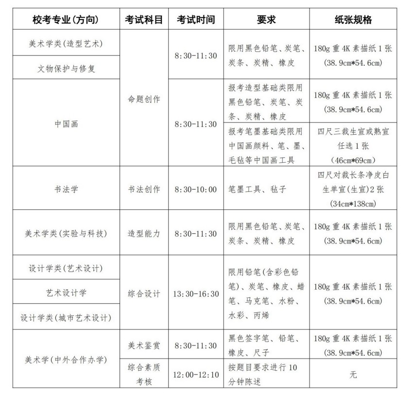 所有專業(yè)考試禁止使用油畫顏料,禁止使用各種圖文數(shù)字模板模具;現(xiàn)場考試禁止使用需外接電源的繪畫輔助工具及設(shè)備。