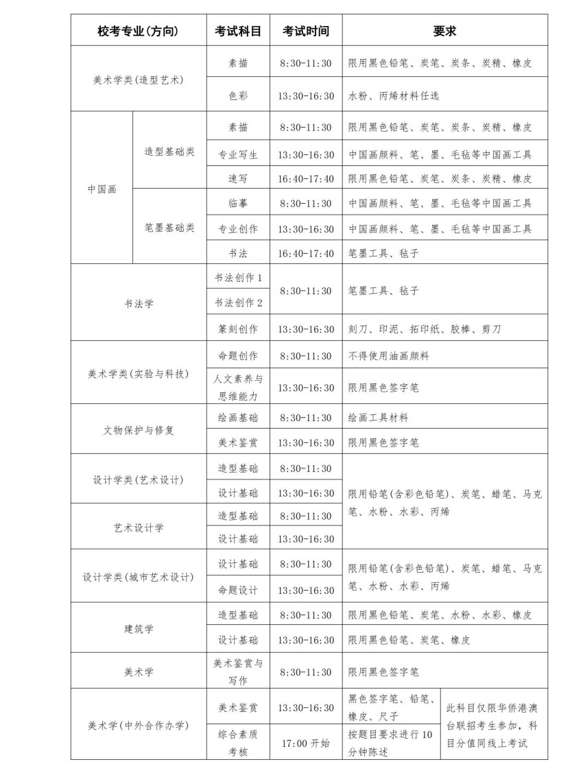 ⒈按照教育部2025年特殊類型招生工作要求,報考我校校考專業(yè)的考生須按《中央美術(shù)學(xué)院2025年本科招生校考專業(yè)(方向)省統(tǒng)考科類對應(yīng)要求》參加省統(tǒng)考。考生在取得對應(yīng)省統(tǒng)考成績合格的基礎(chǔ)上參加校考。