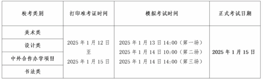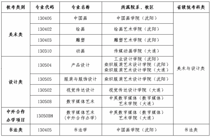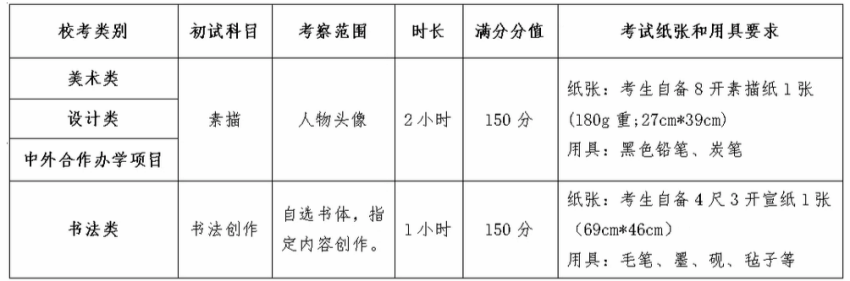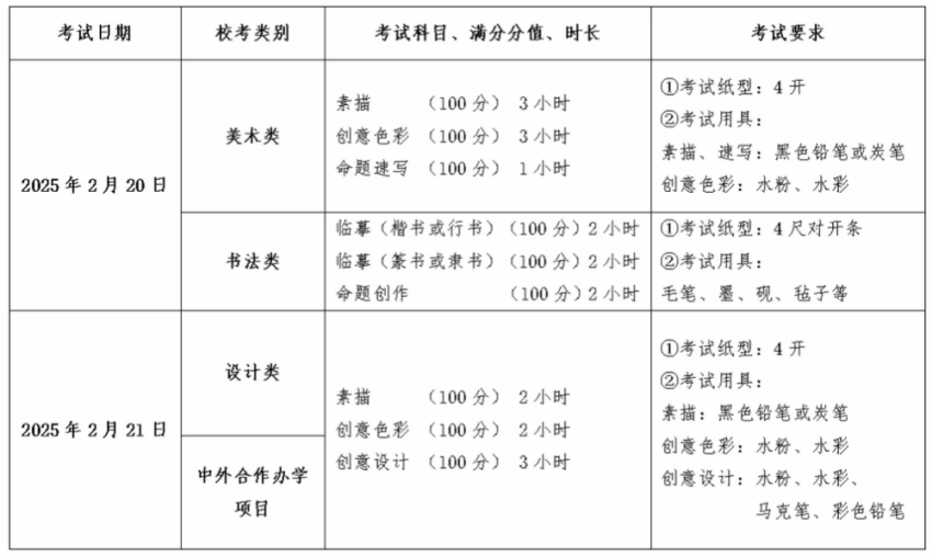 我校2025年藝術(shù)類?紝I(yè)按“網(wǎng)絡(luò)初試+現(xiàn)場復(fù)試”的模式組織考試,?碱悇e分美術(shù)類、設(shè)計(jì)類、中外合作辦學(xué)項(xiàng)目、書法類,按校考類別發(fā)放校考合格證,按專業(yè)錄取。各校考類別包含專業(yè)和省級統(tǒng)考科類要求詳見下表:
