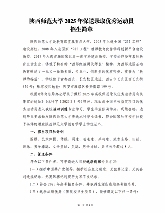 陜西師范大學2025年保送錄取優秀運動員招生簡章
