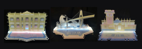 在地域文化主題作品中,僑鄉建筑與閩南煙火氣被巧妙復刻。金門古厝的燕尾脊、騎樓的雕花廊柱,化作了精致小巧的《金門建筑立牌》,指尖輕觸便能感受僑鄉建筑的獨特韻味;閩南建筑的紅磚黛瓦、窗欞紋樣,被搬進《木質紙雕燈設計》,開燈瞬間,光影流轉間盡是古厝的溫柔與詩意;《閩南飲食文化文創冰箱貼》則將泉州五店市戲臺、關岳廟、西街等特色具象化,貼在冰箱上,仿佛能聞到閩南街頭的濃濃煙火氣。