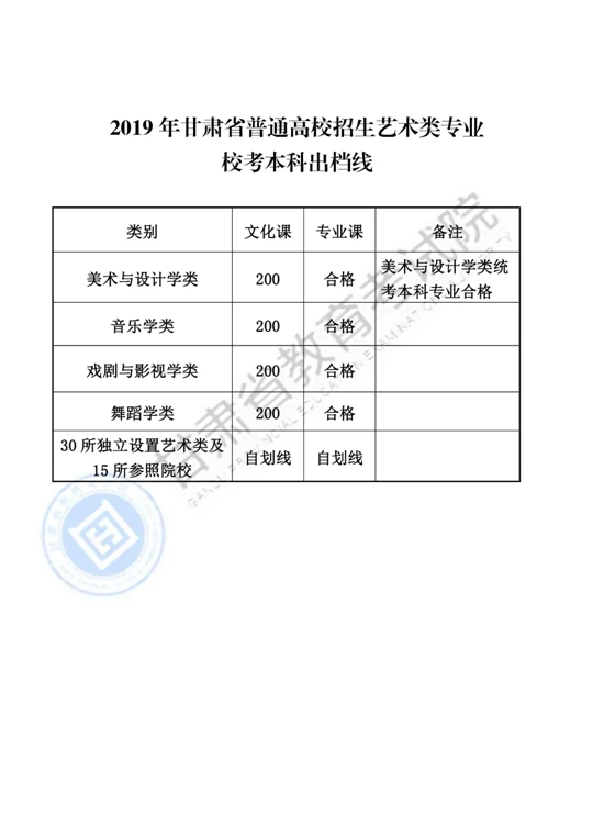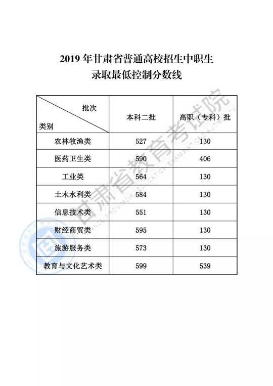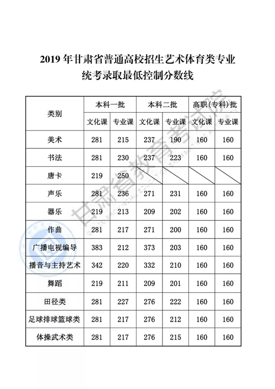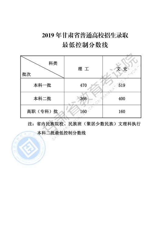 甘肅省2019年普通高校招生錄取最低控制分數(shù)線