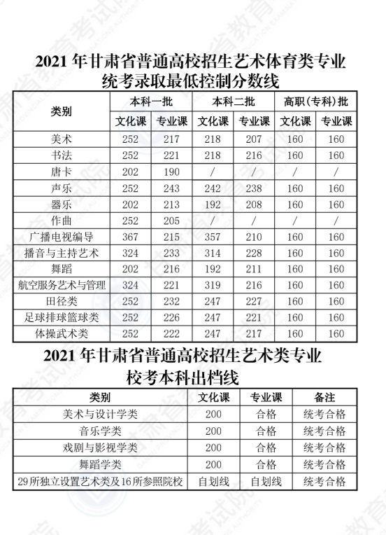 2021年甘肅省普通高校招生錄取最低控制分?jǐn)?shù)線