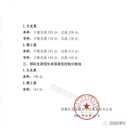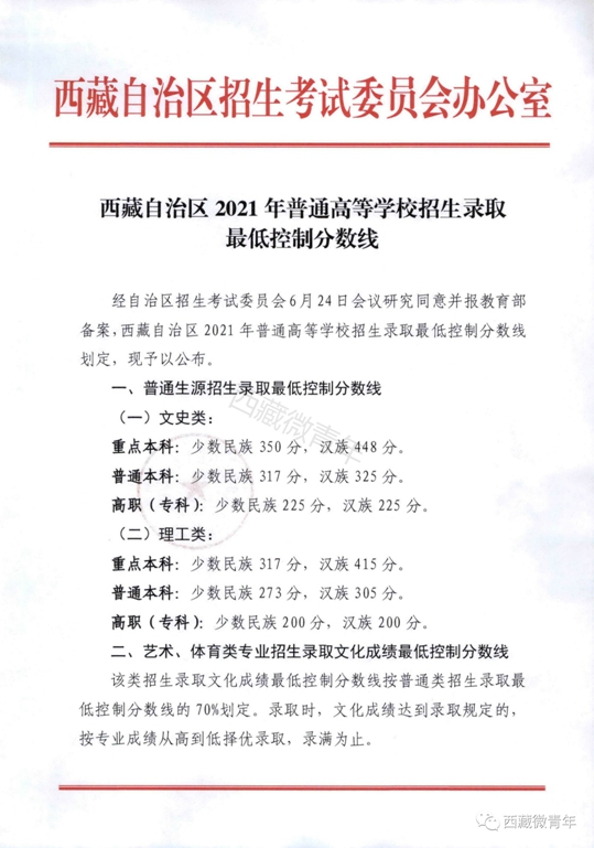西藏:2021年高考錄取最低控制分數線