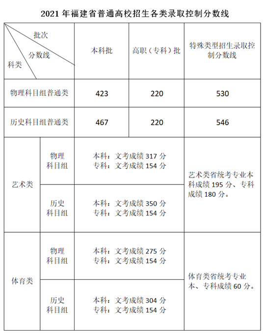 | 2021年福建省普通高校招生錄取控制分數線公布 |
