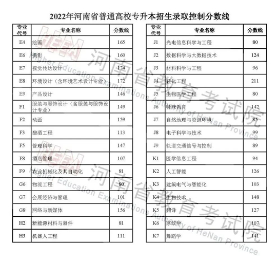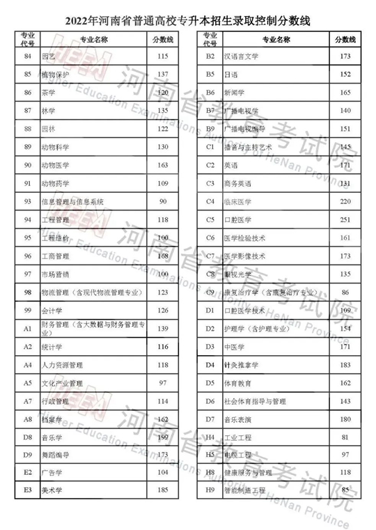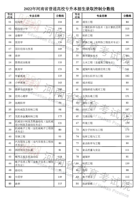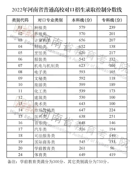 2022年河南省普通高校招生錄取控制分數線