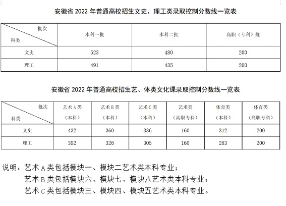 安徽省2022年普通高校招生錄取控制分數線