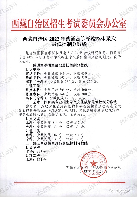 西藏:2022年高考錄取最低控制分數線