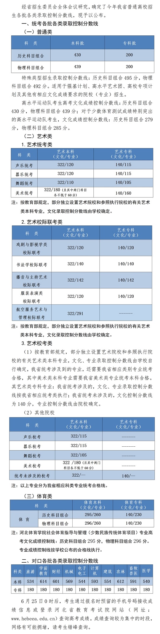 2023年河北省普通高校招生各批各類錄取控制分數線