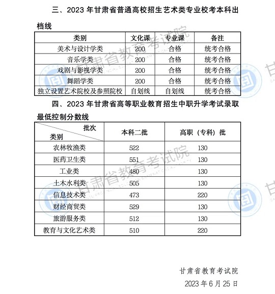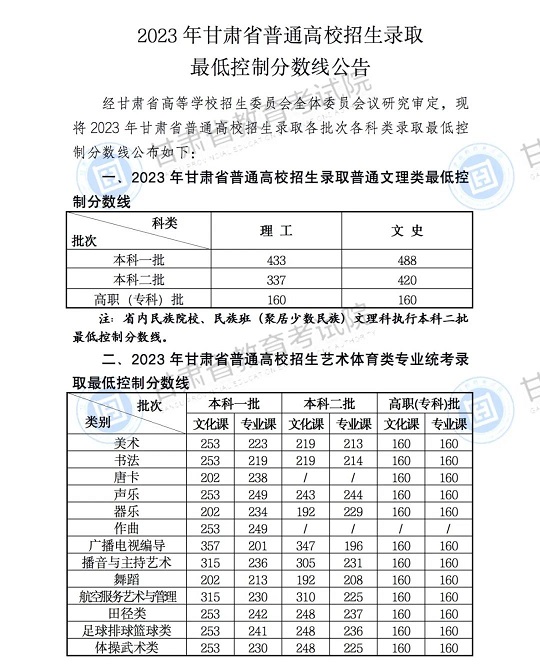 2023年甘肅省普通高校招生錄取最低控制分?jǐn)?shù)線公告
