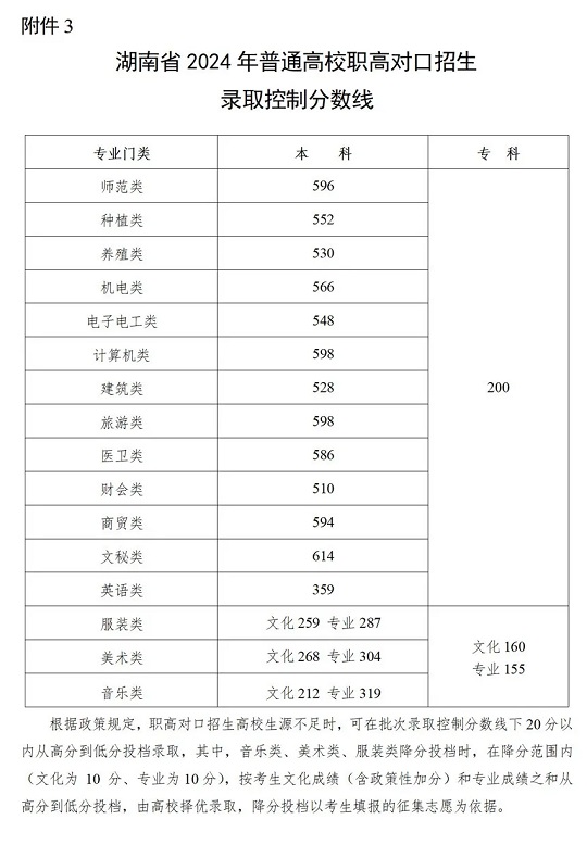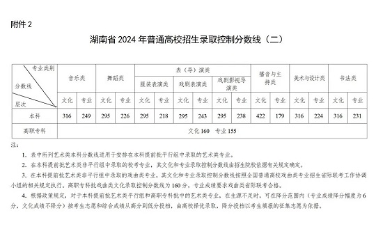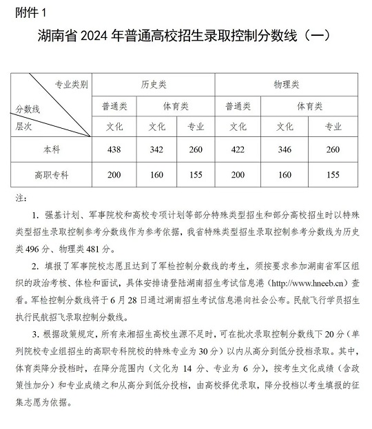 湖南省2024年普通高校招生各批次錄取控制分數線