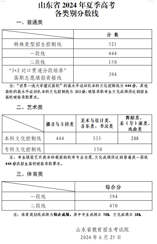 山東省2024年夏季高考各類別分?jǐn)?shù)線