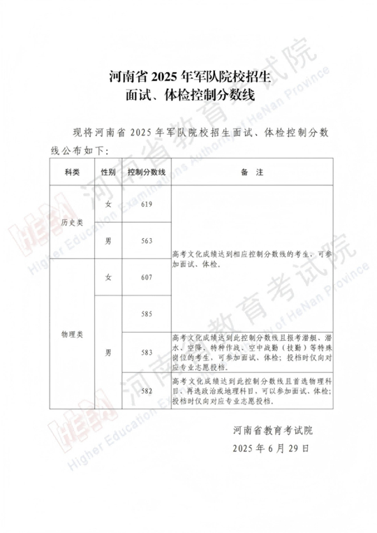河南省2025年軍隊(duì)院校招生面試、體檢控制分?jǐn)?shù)線