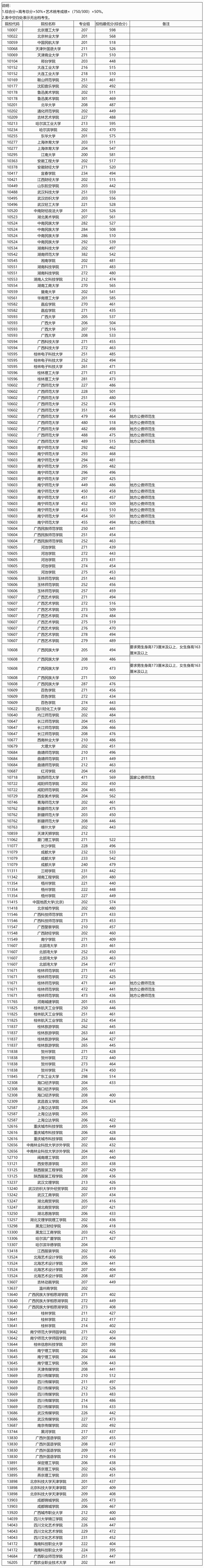 廣西:2025年本科提前批藝術類本科第二批院校專業組投檔最低分數線(首選物理科目組)