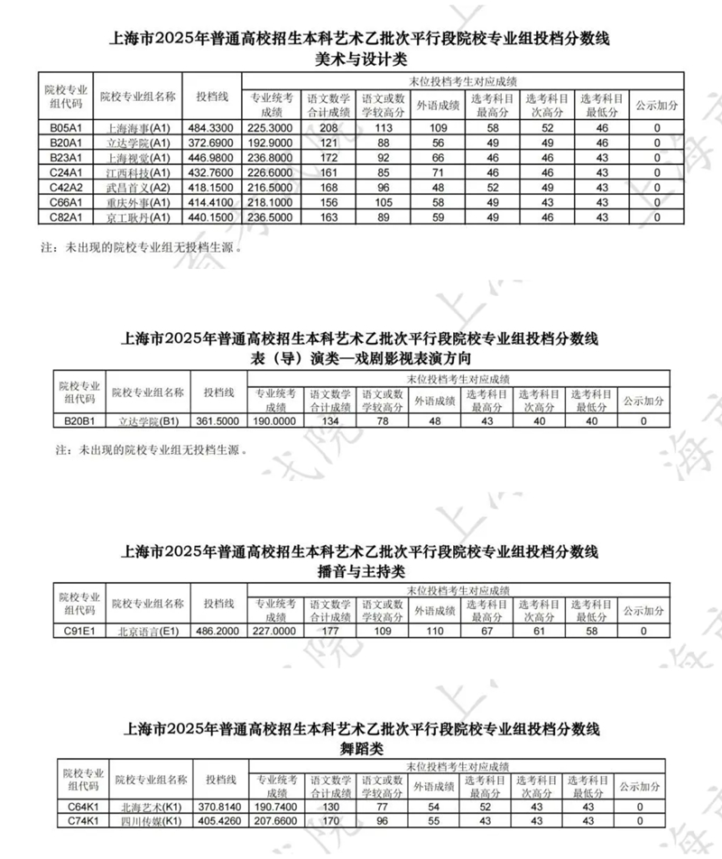 | 上海市2025年普通高校招生本科藝體類乙批次平行段院校專業組投檔分數線 |