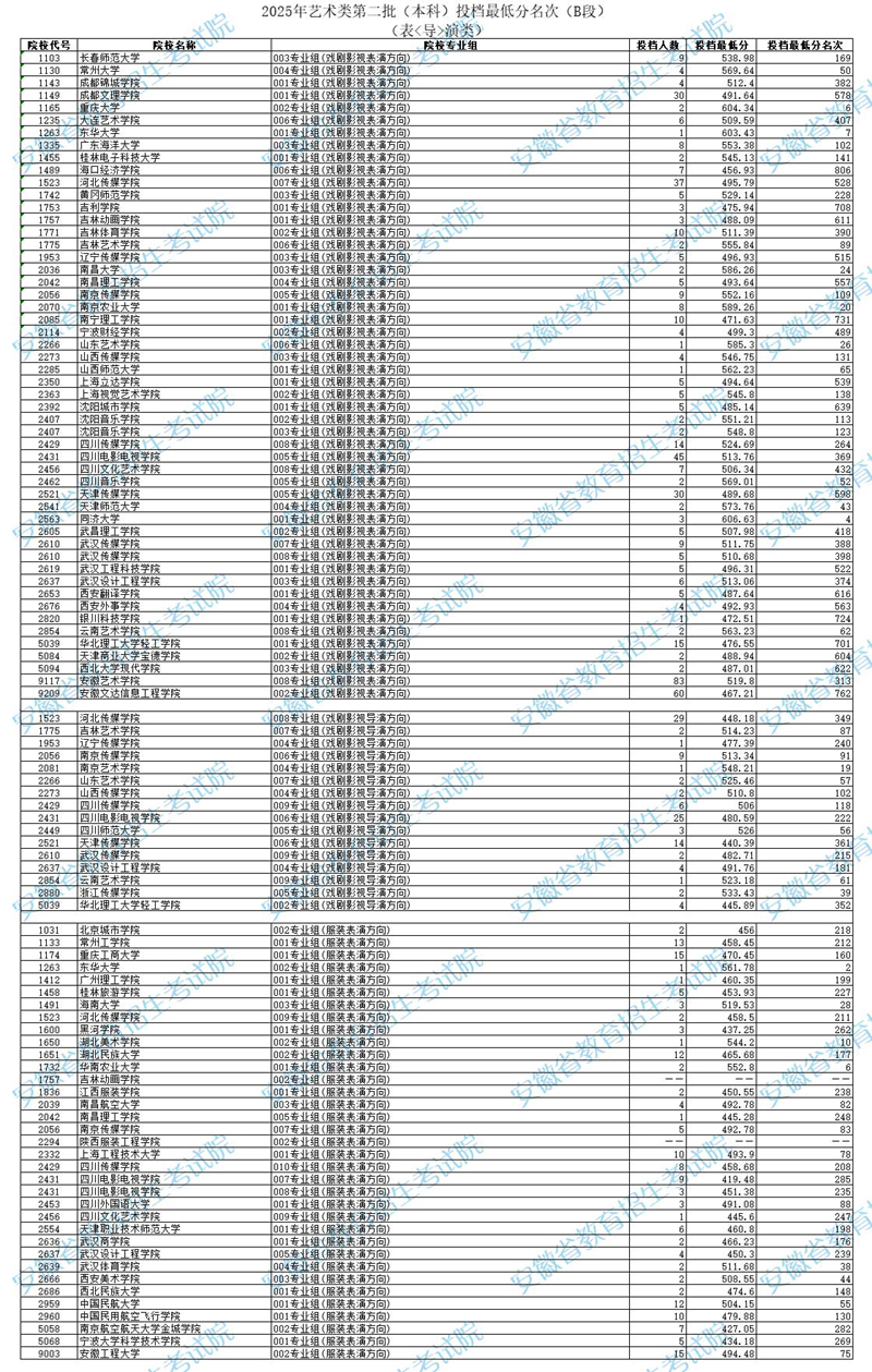安徽:2025年藝術類第二批(本科)投檔最低分名次(B段)(表<導>演類)