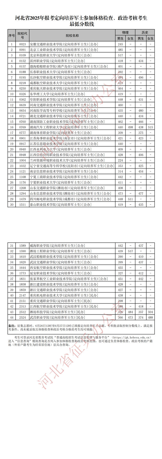 河北省2025年報(bào)考定向培養(yǎng)軍士參加體格檢查、政治考核考生最低分?jǐn)?shù)線(點(diǎn)擊查看PDF文件)
