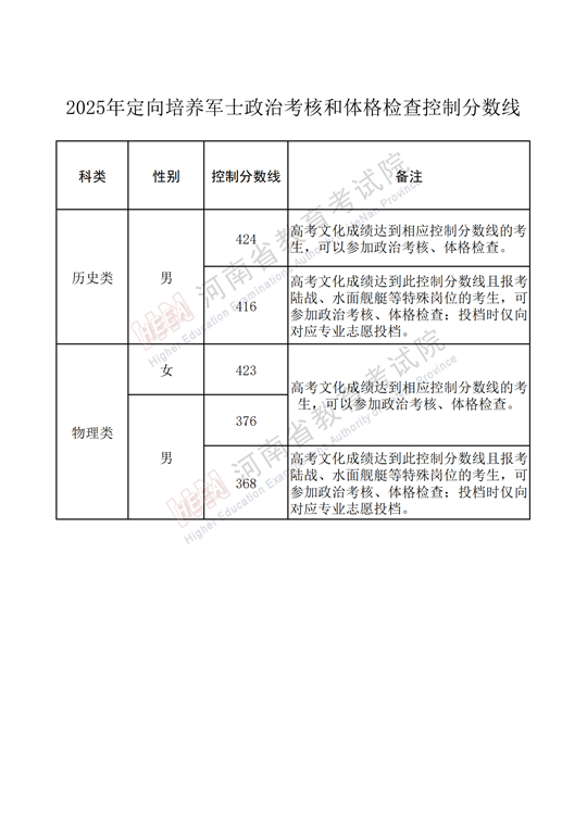 | 河南省2025年普通高校招生定向培養軍士政治考核和體格檢查控制分數線 |