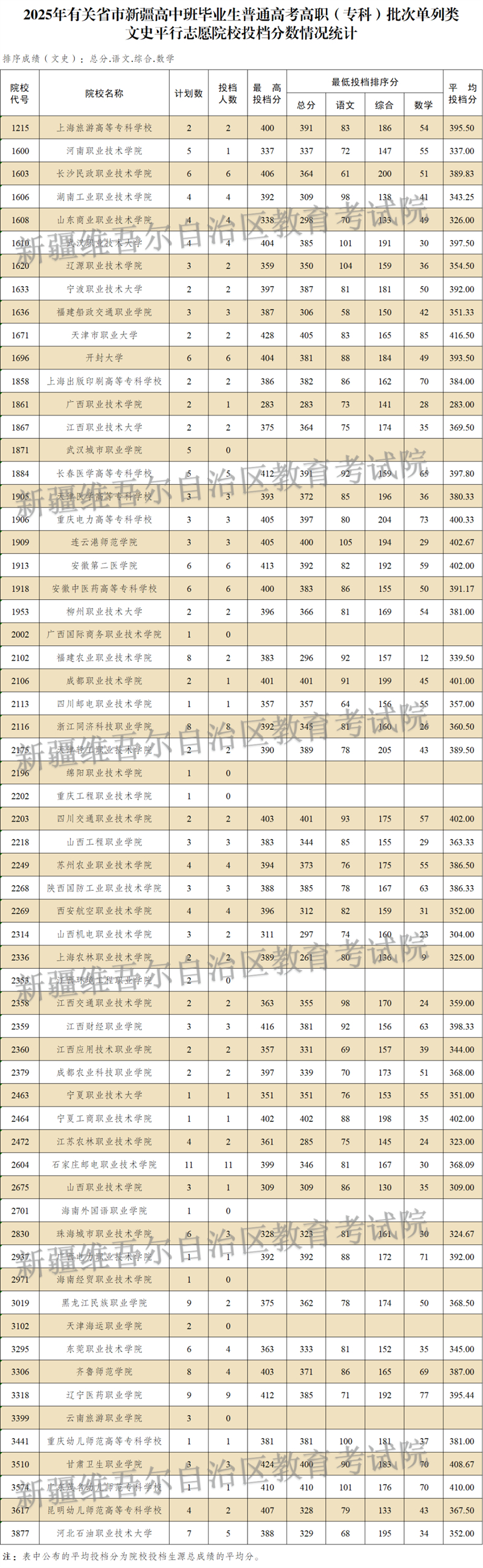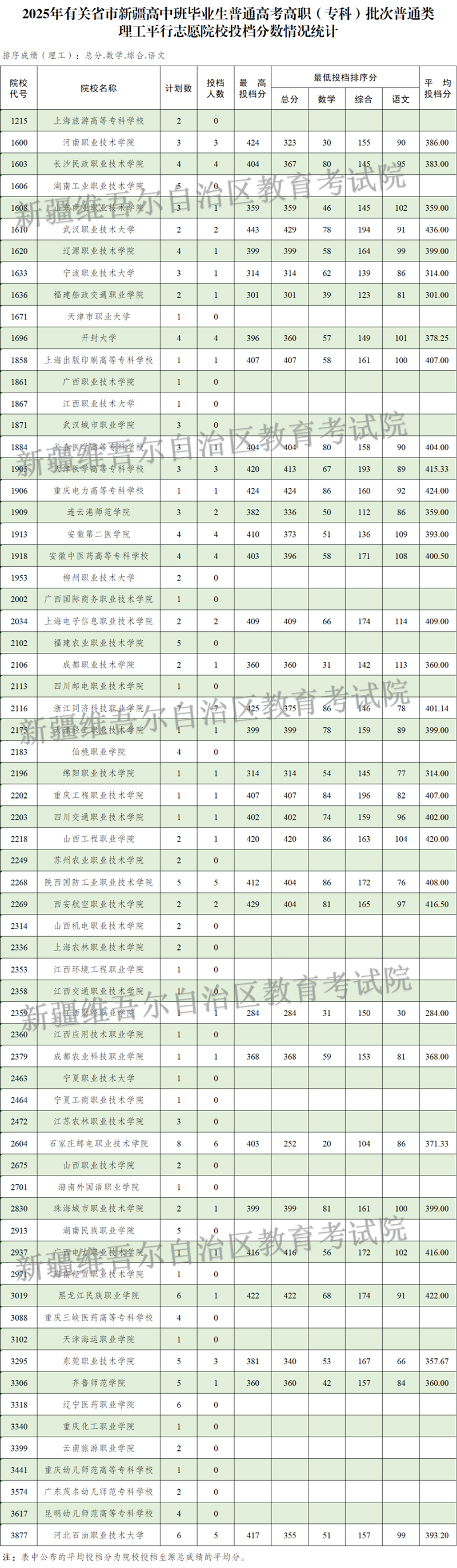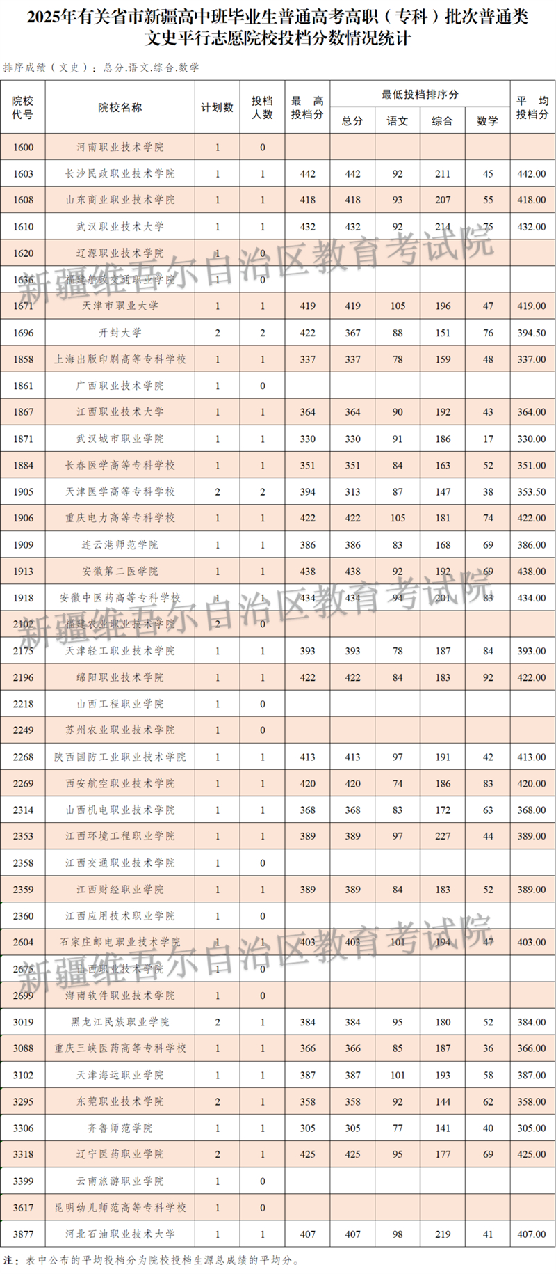 按照錄取工作安排,自治區2025年普通高校招收有關省市新疆高中班畢業生高職(專科)批次于8月14日正式投檔錄取,新疆教育考試院根據投檔原則進行了投檔,現將相關院校投檔情況公布如下: