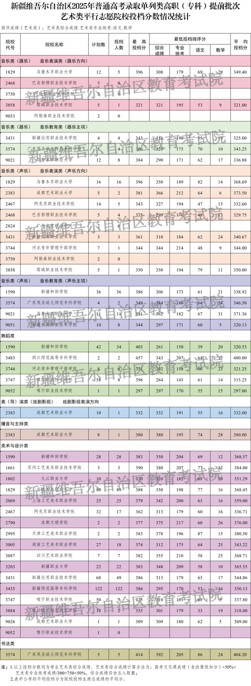 按照錄取工作安排,自治區普通高校招生單列類高職(專科)提前批次藝術類院校(專業)投檔錄取工作于8月16日正式開始,新疆教育考試院根據投檔原則向單列類高職(專科)提前批次藝術類在我區招生院校進行了投檔,現將相關院校投檔情況公布如下: