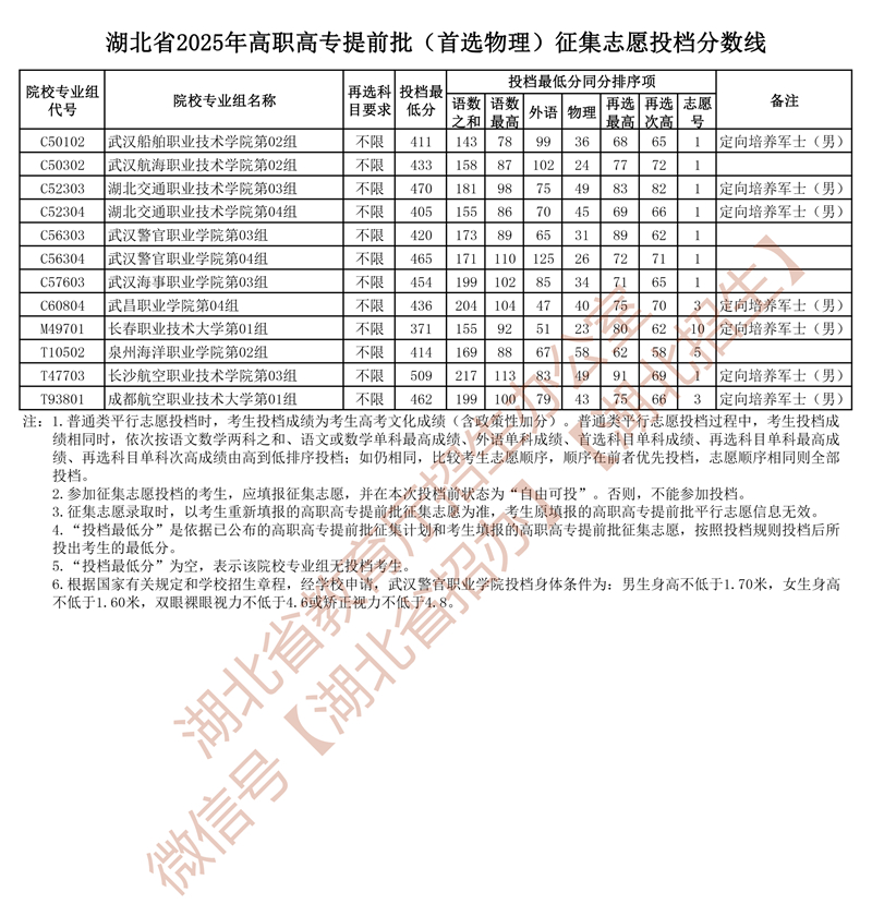 湖北省2025年高職高專提前批(首選物理)征集志愿投檔分數線