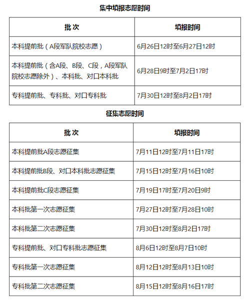 軍隊(含武警,下同)院校招生計劃安排在本科提前批A段,實行順序志愿投檔,設1次集中填報志愿和1次征集志愿,考生每次可填報1所學校,每所學校設6個專業(yè)志愿和1個專業(yè)服從調劑選項。集中填報志愿時間為6月26日12時至6月27日12時。