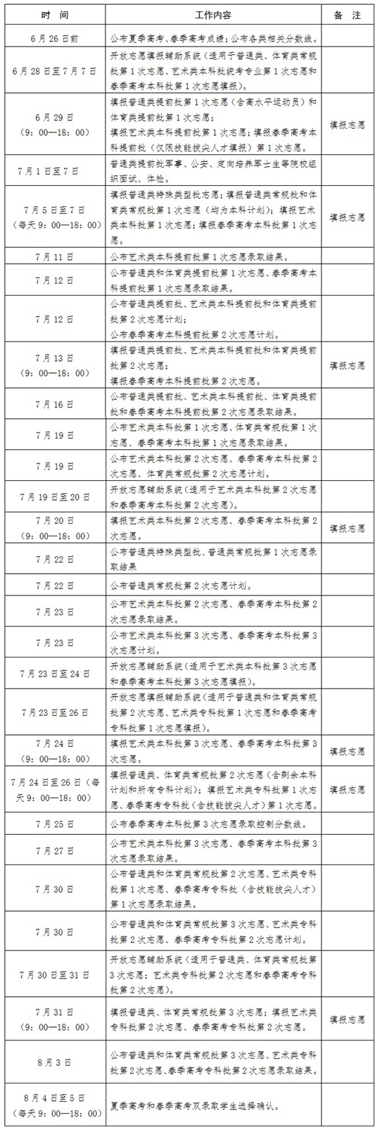 山東省2023年普通高校招生錄取工作進程表