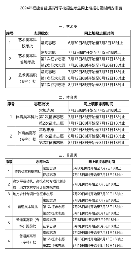 2024年福建省普通高等學校招生考生網上填報志愿時間安排表