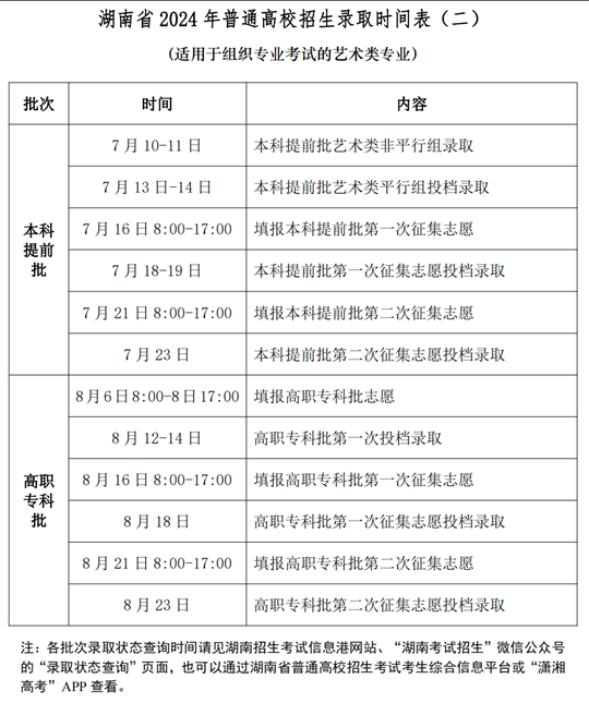 湖南省2024年普通高校招生網上填報志愿及錄取時間表
