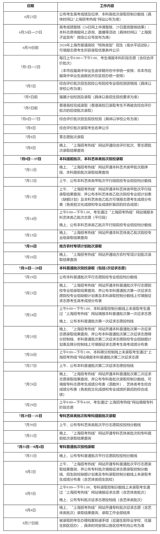 | 2024年上海市普通高等學校招生錄取工作日程 |
