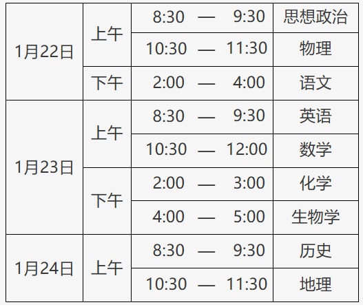 2026年第一次合格考定于1月22日至24日進行。語文考試時間120分鐘,滿分100分。數學考試時間90分鐘,滿分100分。思想政治、歷史、地理、物理、化學、生物學每門科目考試時間60分鐘,滿分100分。