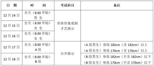 1.形體形象觀測、才藝展示:男生2025年12月14日考試,女生2025年12月15日-16日考試。上午8:30考試,下午13:00考試,上午單元未考完,下午單元考試順延。檢錄時間為上午8:00-8:45,下午12:30-13:15,未按規定時間檢錄和參加考試的,視為放棄考試!残误w形象觀測(四樓402室),才藝展示(一樓101表演廳)〕。