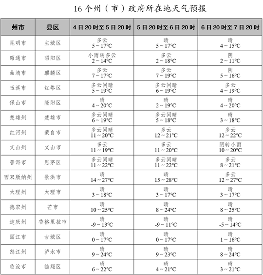 預計12月4日20時至7日20時,昭通市、曲靖市東部、文山州東部、紅河州南部、普洱市東南部多云間陰有小雨,其他大部分地區晴間多云。