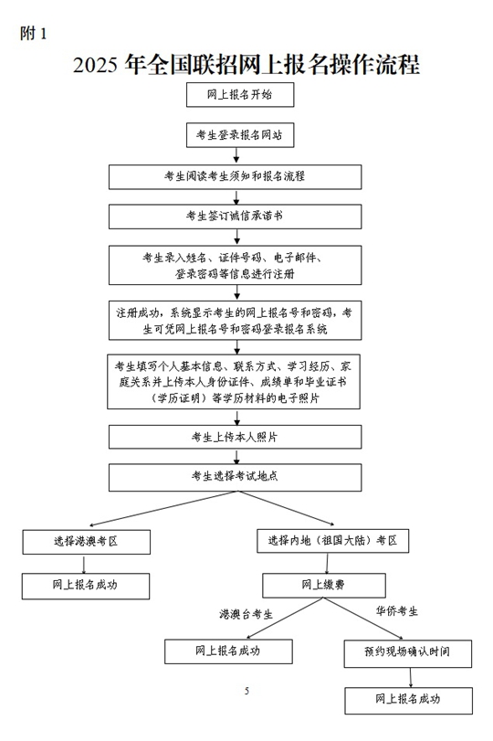 所有考生均須在上述規定時間內登錄系統,按要求進行注冊,輸入報考信息,上傳本人照片、身份證件及學歷資料電子照片,選擇考試地點。考試地點一旦提交,包括但不限于個人信息、考試地點等內容,均不得再進行修改。內地考點考生還須完成網上繳費,華僑考生須預約現場確認報名時間,逾期不再受理。網上報名成功后,報名狀態顯示為“待確認”。網上報名流程見附1。