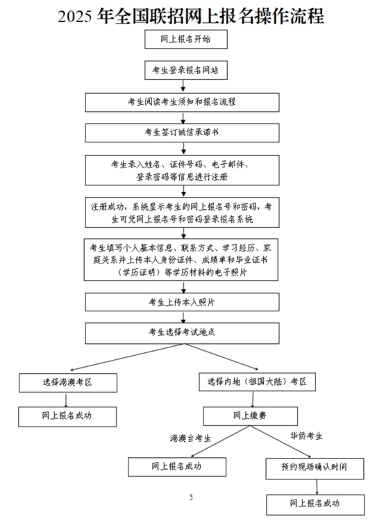 所有考生均須在上述規(guī)定時(shí)間內(nèi)登錄系統(tǒng),按要求進(jìn)行注冊(cè),輸入報(bào)考信息,上傳本人照片、身份證件及學(xué)歷資料電子照片,選擇考試地點(diǎn)。考試地點(diǎn)一旦提交,包括但不限于個(gè)人信息、考試地點(diǎn)等內(nèi)容,均不得再進(jìn)行修改。內(nèi)地考點(diǎn)考生還須完成網(wǎng)上繳費(fèi),華僑考生須預(yù)約現(xiàn)場(chǎng)報(bào)名確認(rèn)的時(shí)間,逾期不再受理。網(wǎng)上報(bào)名成功后,報(bào)名狀態(tài)顯示為“待確認(rèn)”。網(wǎng)上報(bào)名流程詳見(jiàn)下方。