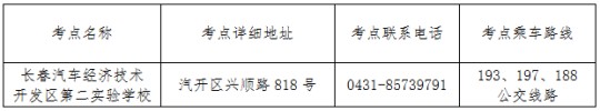 考點(diǎn)名稱:長(zhǎng)春汽車經(jīng)濟(jì)技術(shù)開(kāi)發(fā)區(qū)第二實(shí)驗(yàn)學(xué)校。考點(diǎn)信息如下表: