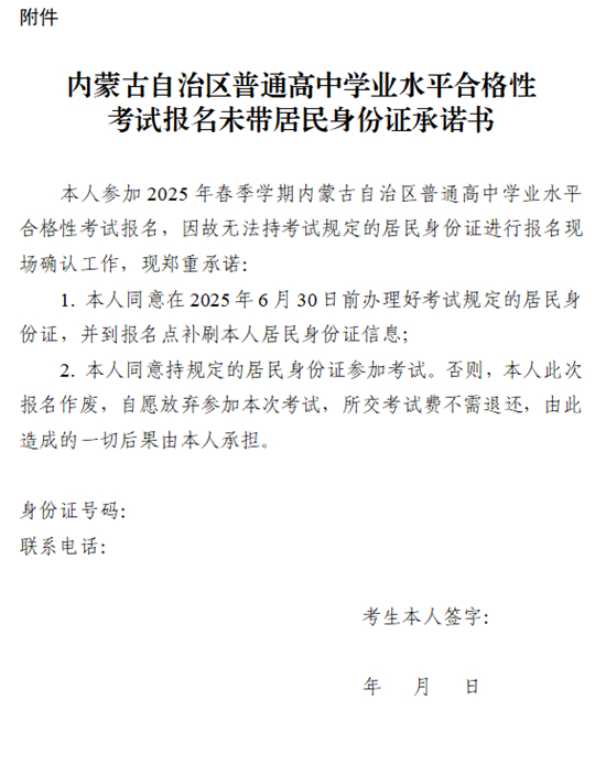 附件:內蒙古自治區普通高中學業水平合格性考試報名未帶居民身份證承諾書(點擊查看)