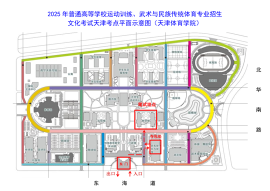 1.確認好考試時間地點。考生務必要確認好每門科目的考試時間與考點考場信息。考點入口為天津體育學院新校區東門,進入校園后根據引導到達考場所在教學樓,考點位置詳見附圖。家長及陪考人員不得進入考點。上午考試結束后須離開考點,請提前做好中午用餐以及休息的準備。