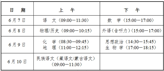 全國統考科目考試時間按照教育部安排進行,選考科目與全國統考科目同步進行,考試時間安排在6月7日至10日。語文科目考試時長為150分鐘,數學、外語科目(含聽力部分)考試時長為120分鐘,選考科目考試時長均為75分鐘。民族語文科目考試時長為150分鐘。如全國統考科目考試時間調整,選考科目考試時間相應調整。具體考試時間安排如下: