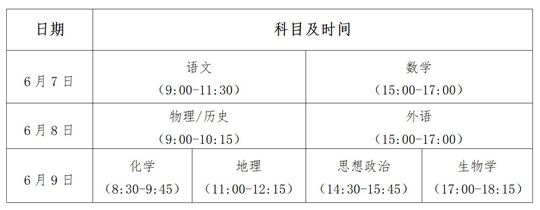 考試時間為6月7日至9日。語文科目考試時長為150分鐘,數(shù)學(xué)、外語科目考試時長為120分鐘,選擇性考試科目考試時長均為75分鐘。具體考試時間安排如下: