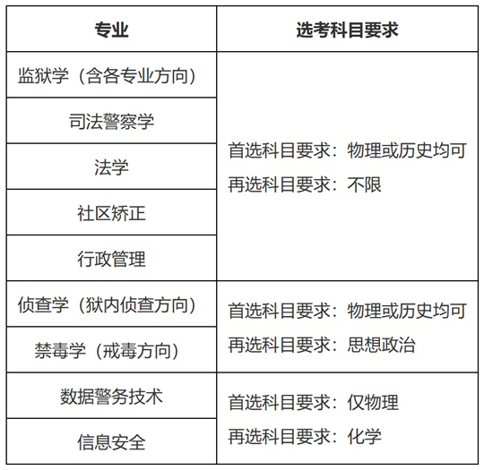 報(bào)考中央司法警官學(xué)院偵查學(xué)(獄內(nèi)偵查方向)、禁毒學(xué)(戒毒方向)必選政治科目,數(shù)據(jù)警務(wù)技術(shù)、信息安全必選物理、化學(xué)科目,其他專(zhuān)業(yè)選考科目不限。各專(zhuān)業(yè)選考科目要求見(jiàn)下表: