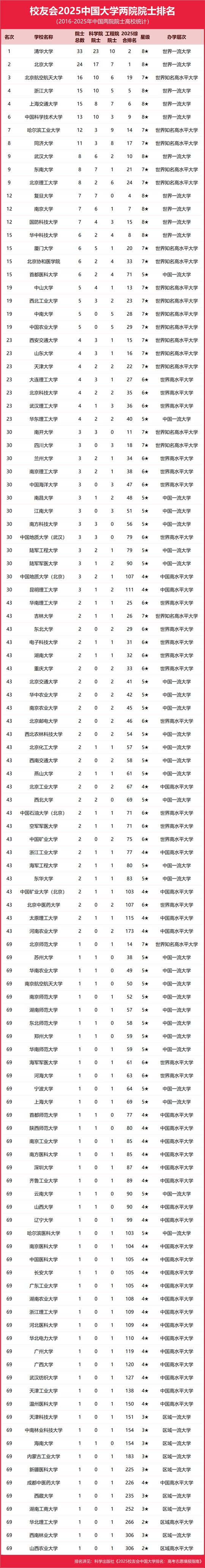 | 校友會2025中國大學兩院院士排名,清華大學、北京大學問鼎冠亞軍 |