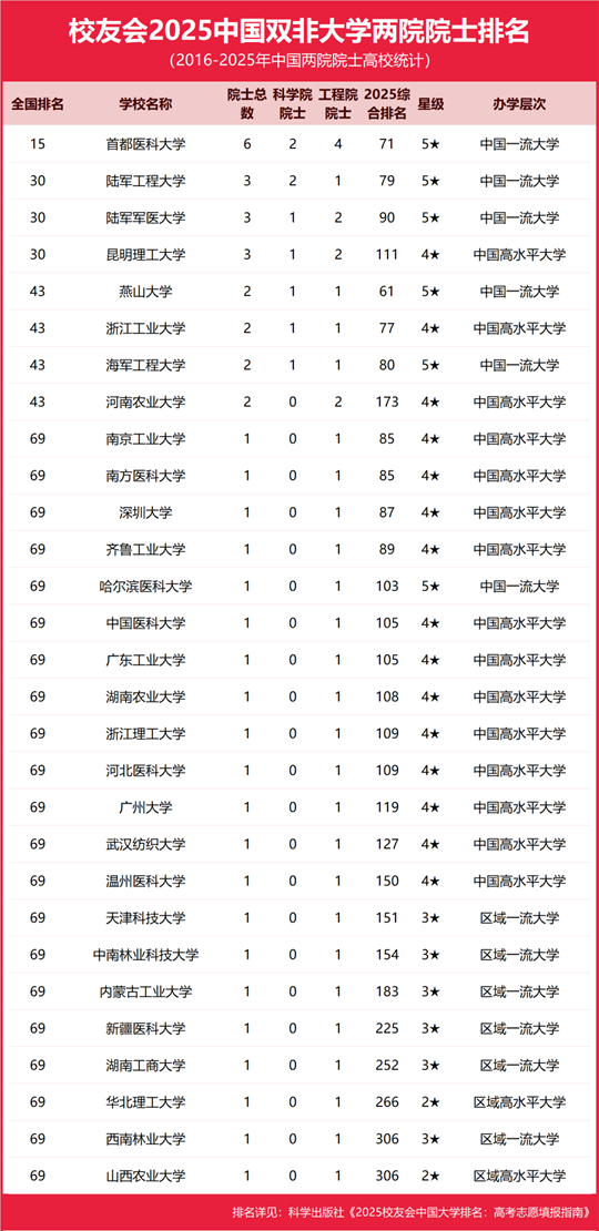 首都醫科大學雄居2025中國雙非大學兩院院士排名冠軍,燕山大學、河南農業大學等8校挺進全國50強