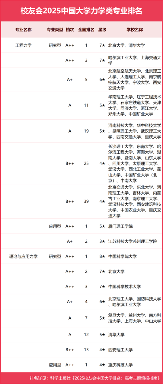 校友會2025中國大學(xué)力學(xué)類專業(yè)排名(研究型)